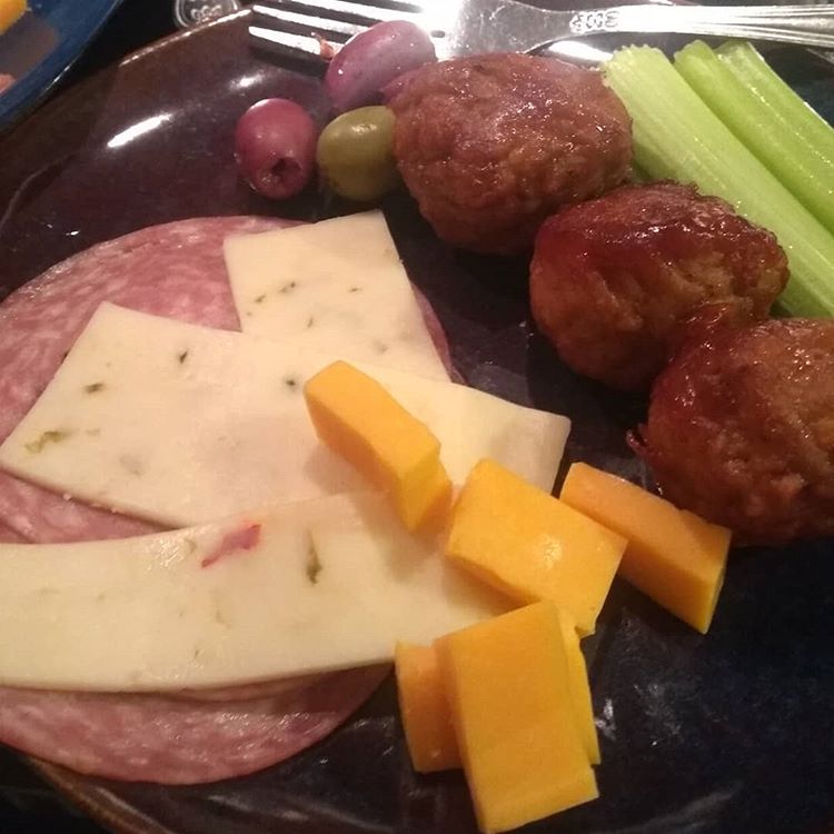 Antipasto platter – example: salami, pre-made meatballs or other cold cuts, with a side of cheese cubes/slices, olives, and celery – drizzle plate with a little olive oil and sprinkle with salt