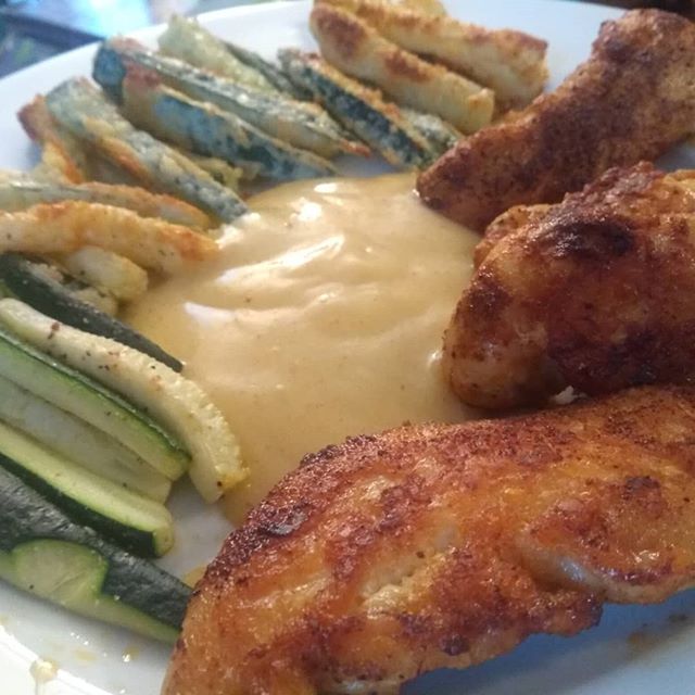Blackened chicken tenders with zucchini fries, sugar free honey mustard for dipping