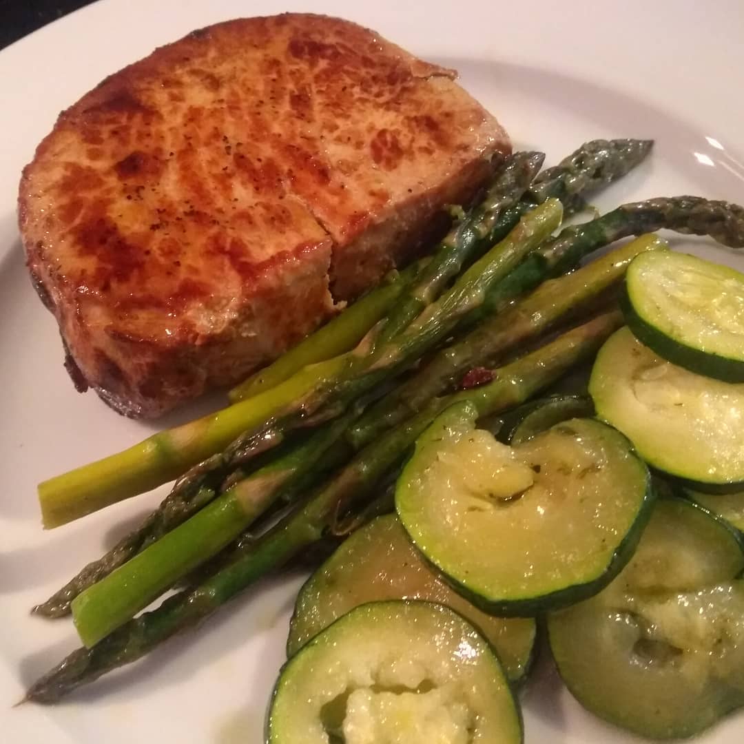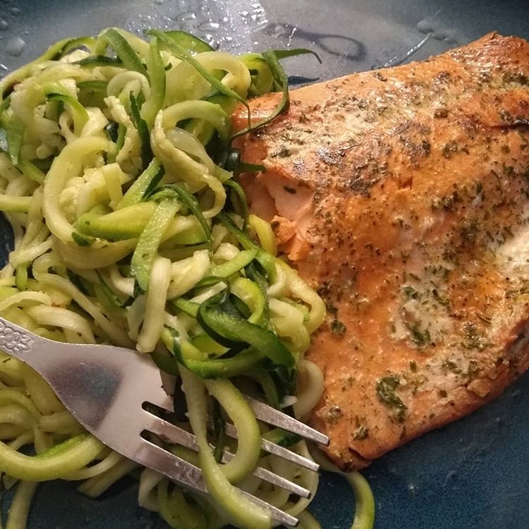 Salmon coated in lemon pepper seasoning, lightly seared in olive oil, side of zucchini noodles