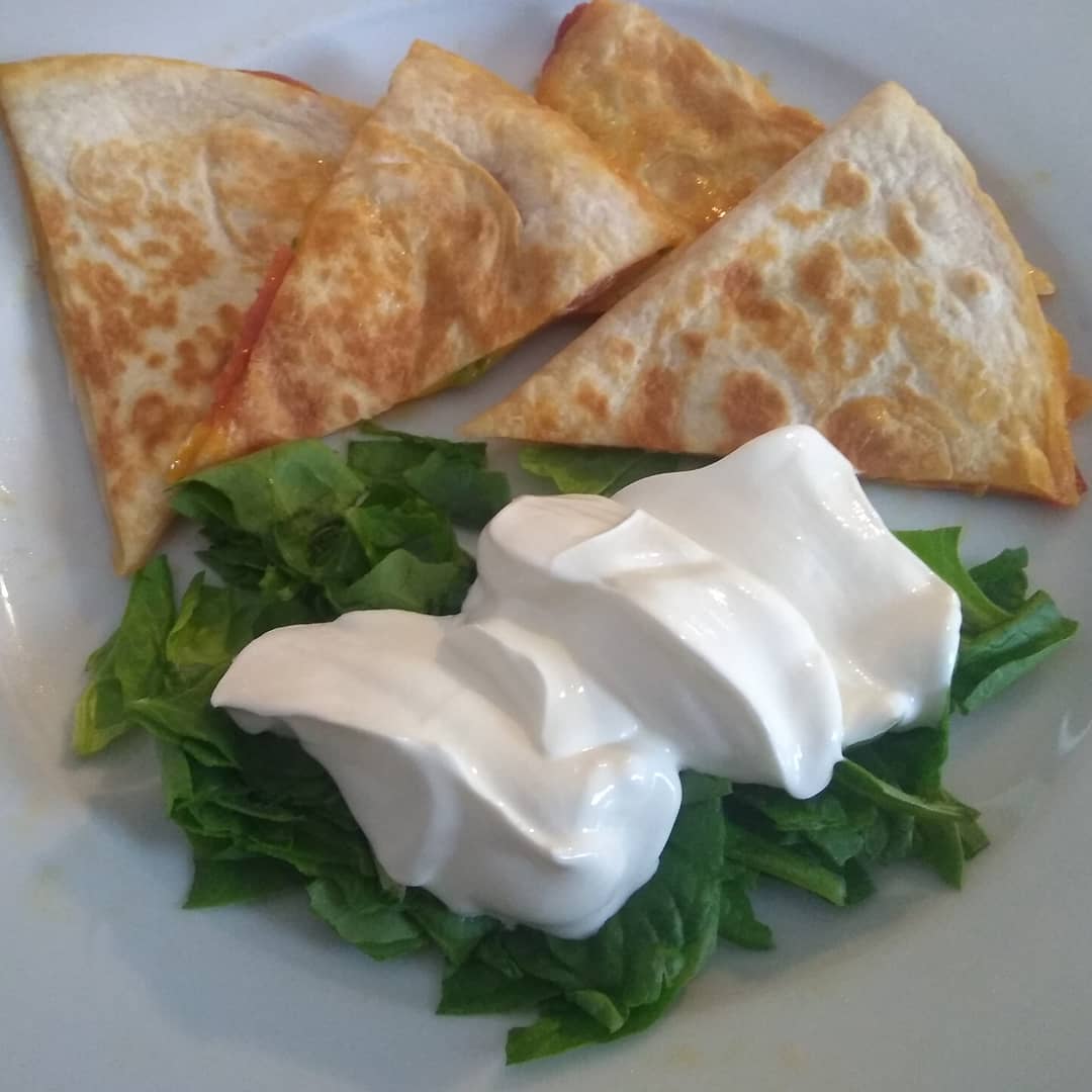 Low carb tortilla quesadillas stuffed with meat and cheese, side of sour cream mixed with spinach for dipping