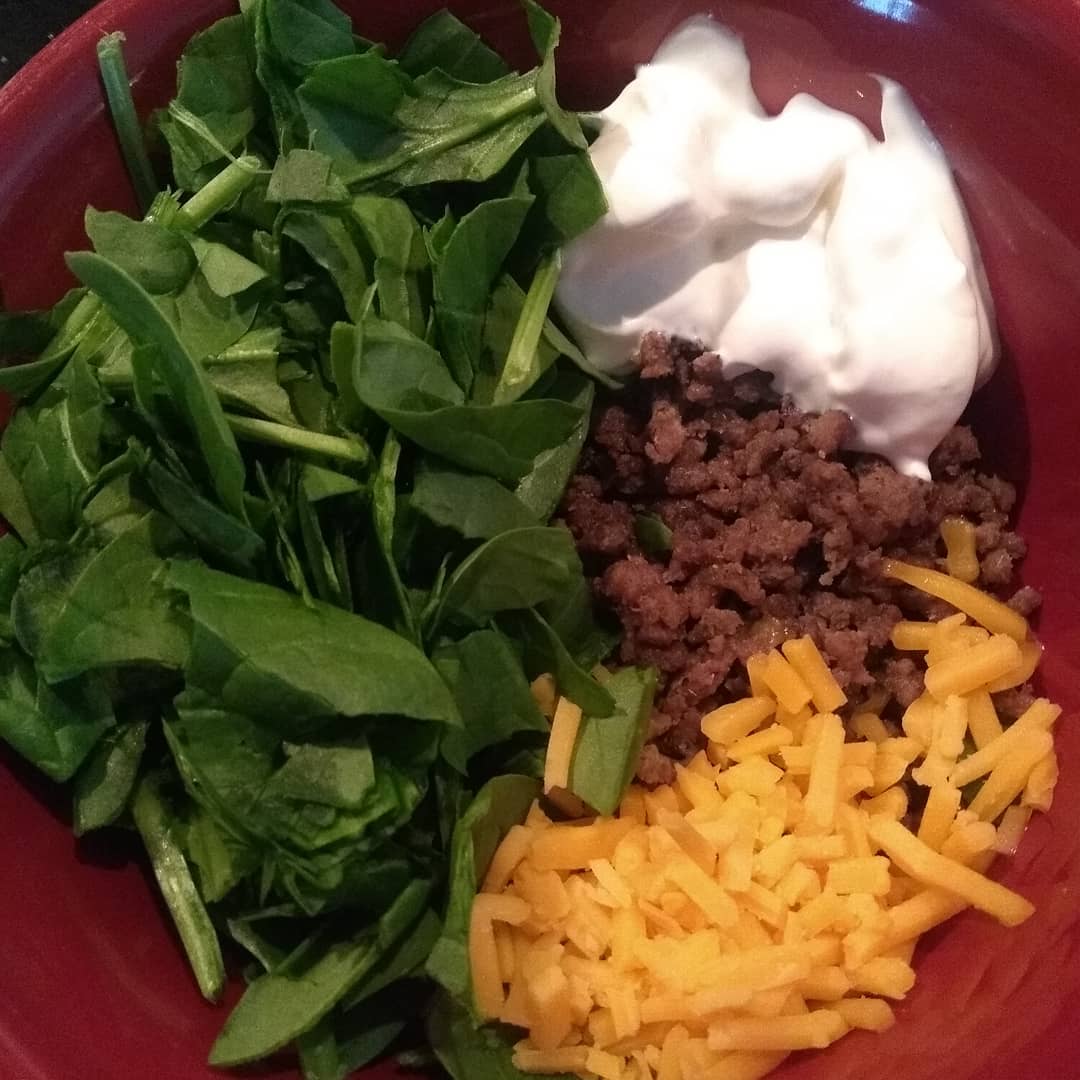 Taco bowl – example: ground beef with taco seasoning, chopped lettuce or spinach, topped with optional green onions, halved cherry tomatoes, sour cream, and cheese