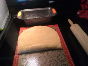6. Optional: Place the kneaded dough between two sheets of parchment paper or silicone mats and roll it out to a flatish rectangle where the shorter side is about the width of your loaf pan (so it fits!). This doesn’t have to be perfect. From the short side of the rectangle, start rolling the dough inward until it makes a log (it’s kinda like rolling a log for pinwheels or cinnamon rolls).