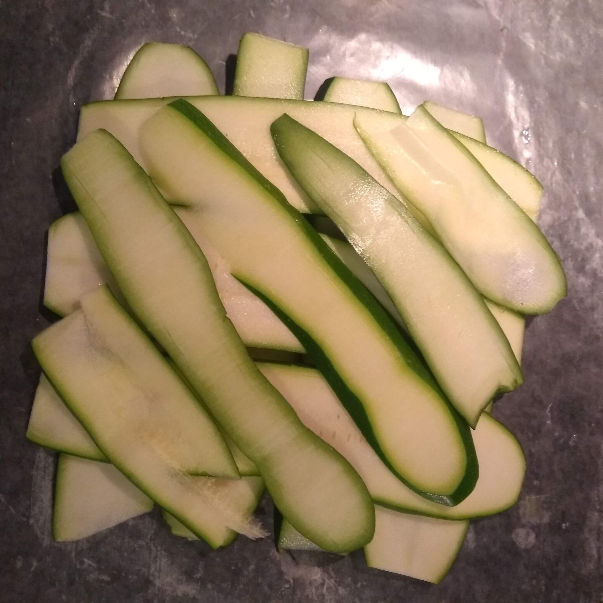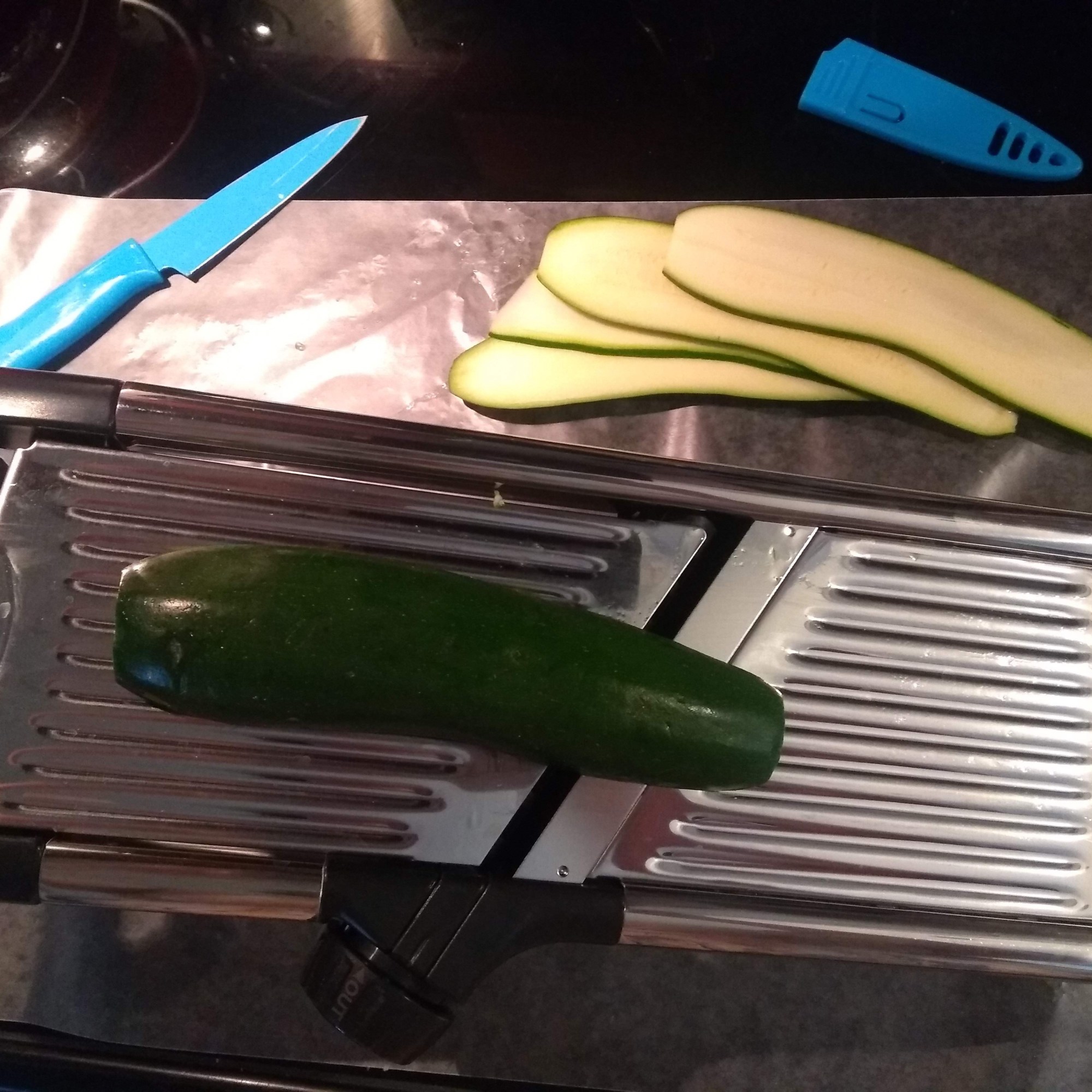2. Cut the ends off the zucchinis then thinly slice length-wise. Alternatively, you can slice the zucchini into thin medallions. Layer the zucchini slices into rows between paper towels and set aside or in the fridge.