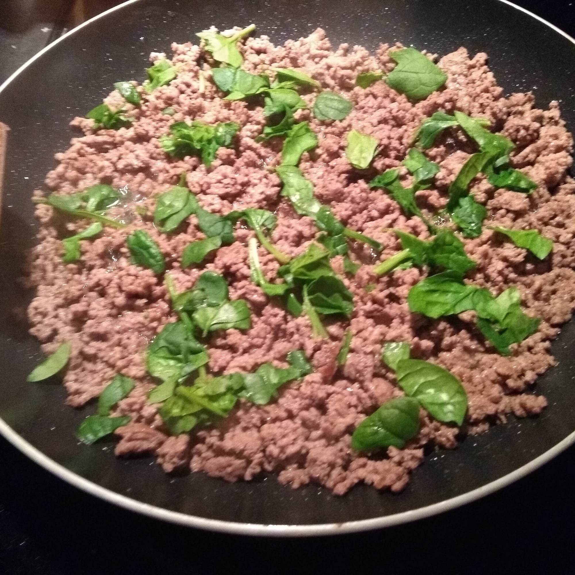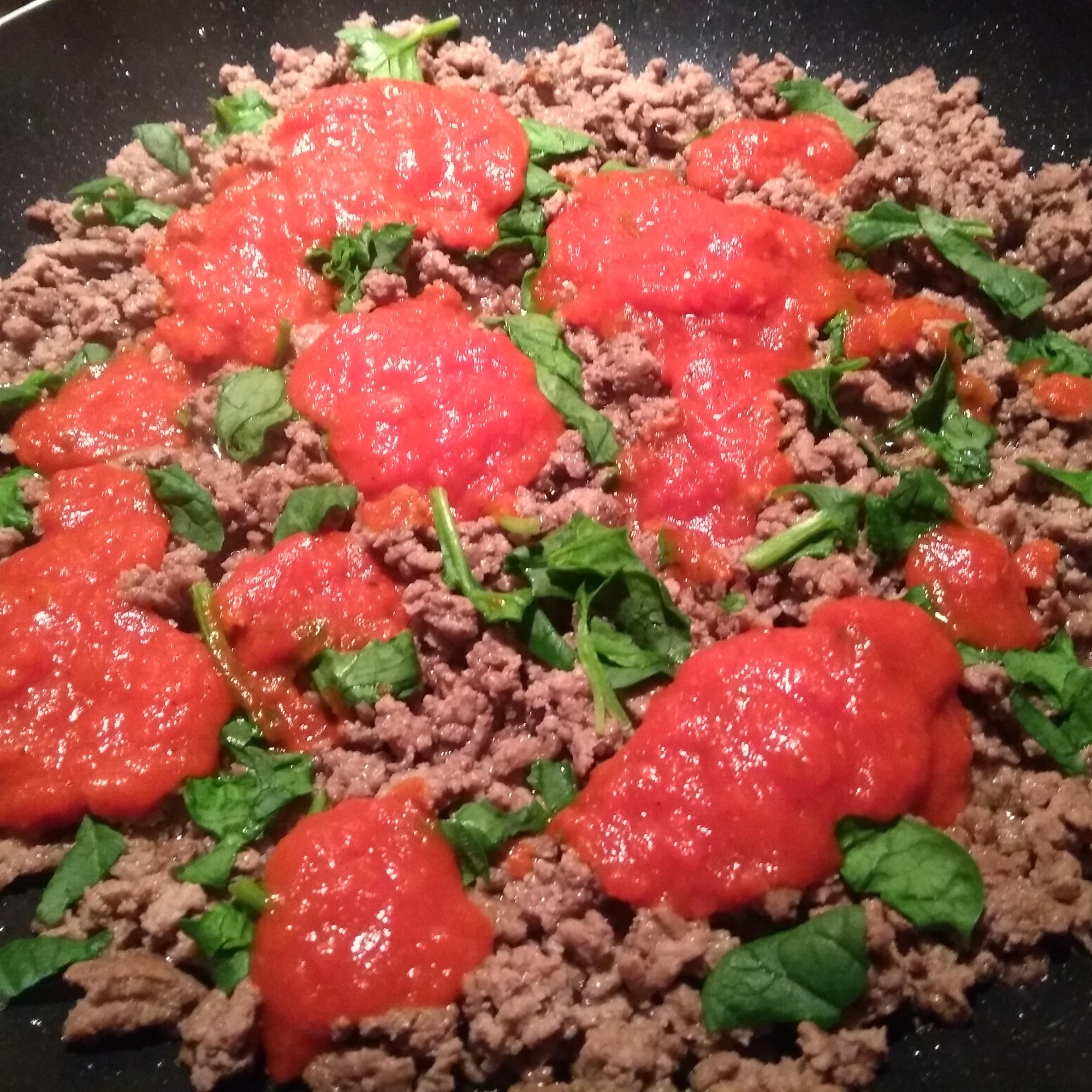 4. Add Rao’s Marinara and Baby Spinach to pan with ground beef. Gently fold and stir until spinach is slightly wilted. Turn off the burner and let ground beef mixture cool down for a few minutes.