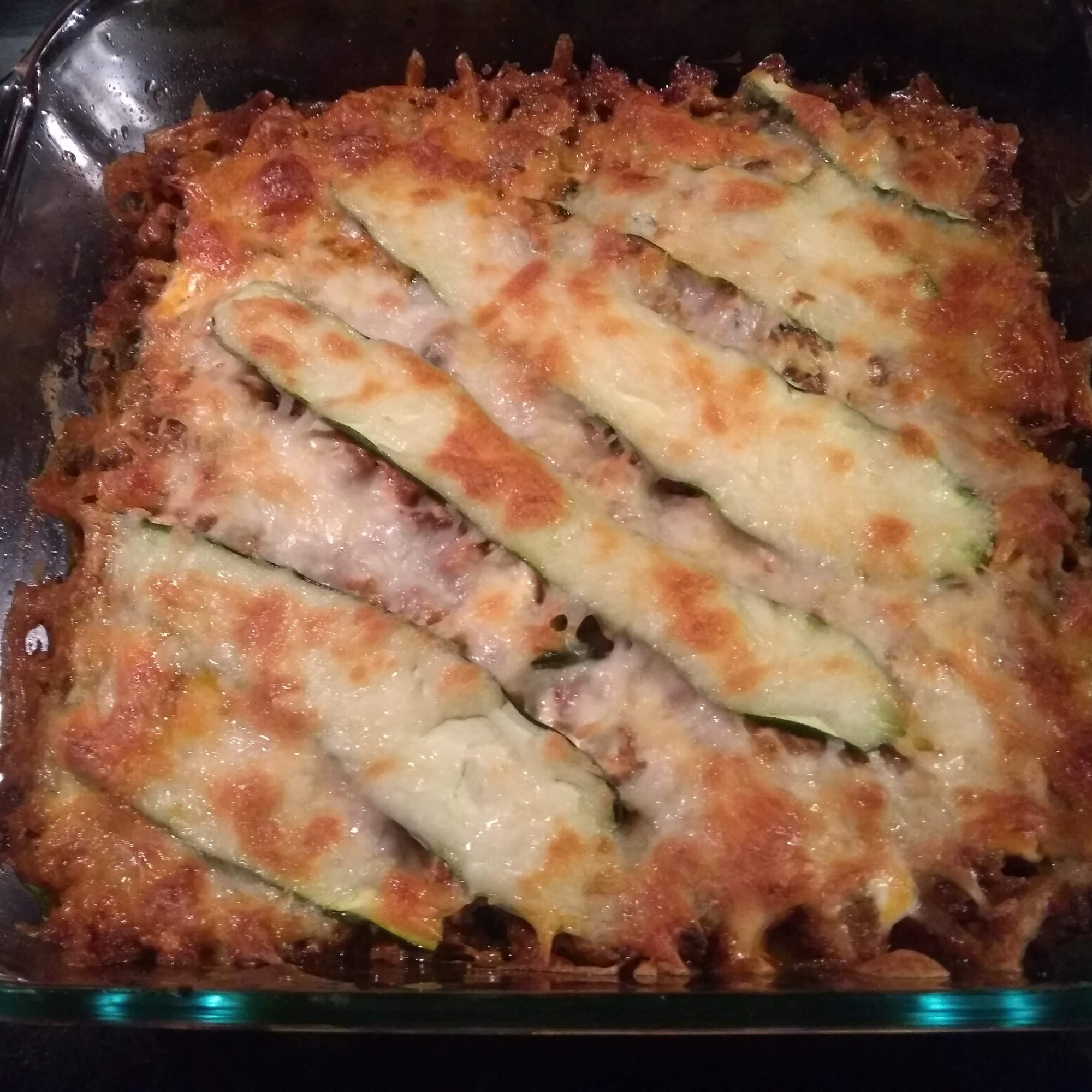 - Repeat the layers one more time – start with Zucchini slices, then ground beef mix, then cream cheese mix/sprinkle mozzarella.