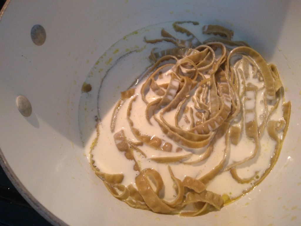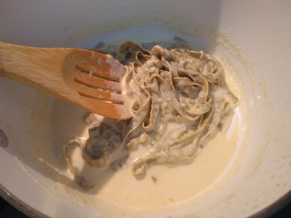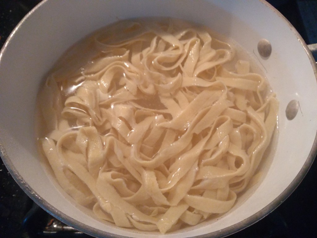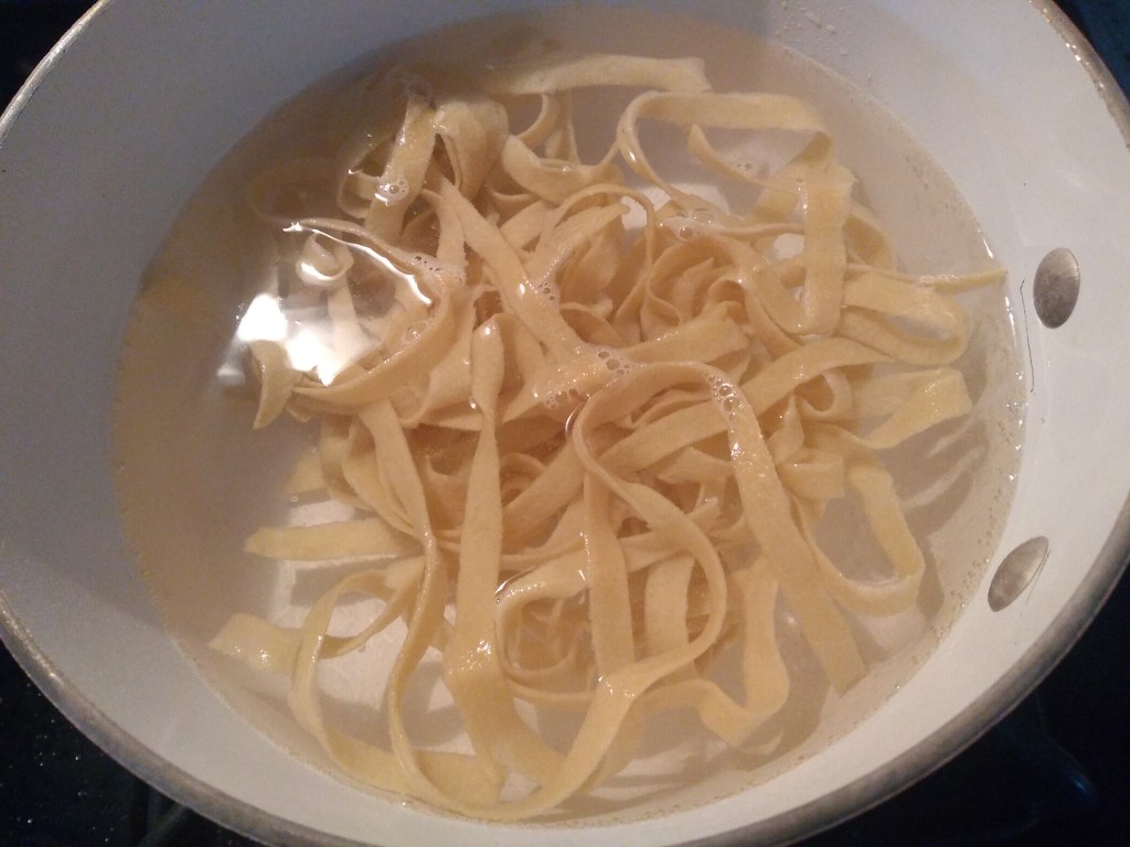 Basically, we made the dough in the mixer, let it rest for 30 minutes, rolled it out relatively flat, and then put it through the pasta machine. We made it as thin as possible, then put it through the cutting side of the machine to make fettuccine. After separating the strands, we placed them in heavily salted boiling water for about 3 minutes then strained. I think they could’ve gone for a minute longer for my tastes. The hubs thought it was the best pasta we’ve ever made.