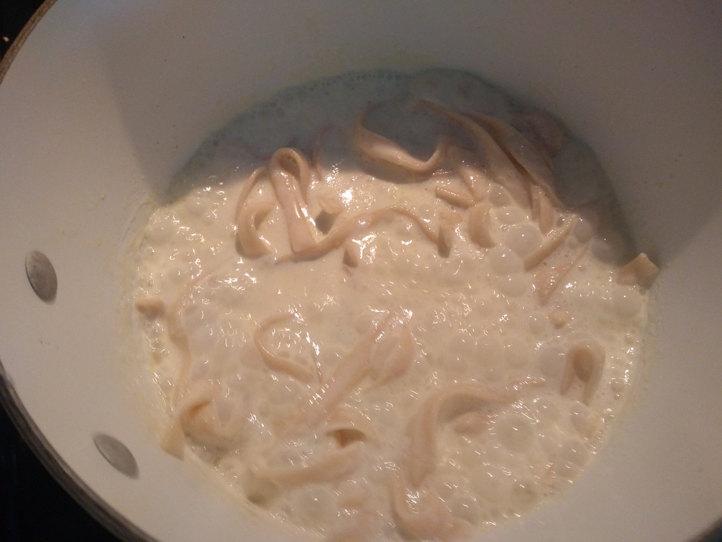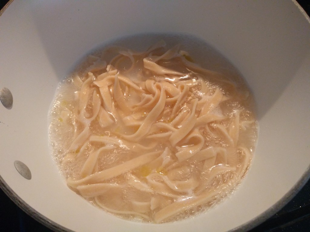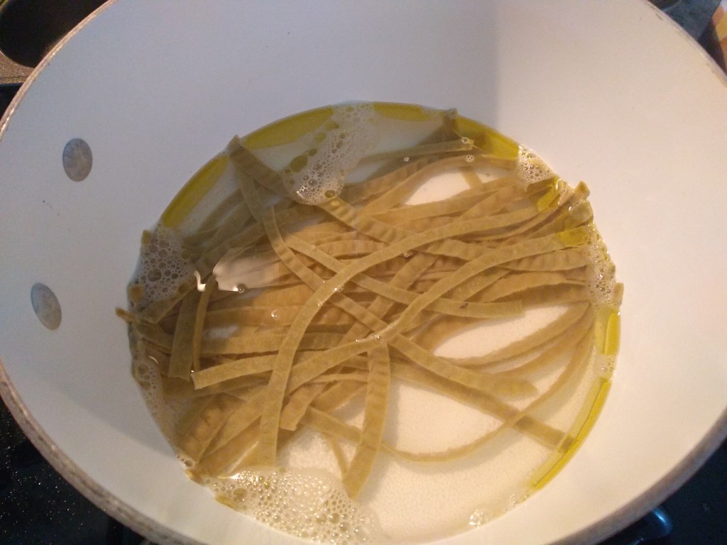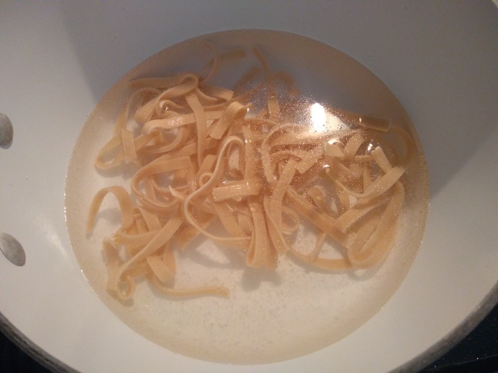 Basically, we made the dough in the mixer, let it rest for 30 minutes, rolled it out relatively flat, and then put it through the pasta machine. We made it as thin as possible, then put it through the cutting side of the machine to make fettuccine. After separating the strands, we placed them in heavily salted boiling water for about 3 minutes then strained. I think they could’ve gone for a minute longer for my tastes. The hubs thought it was the best pasta we’ve ever made.